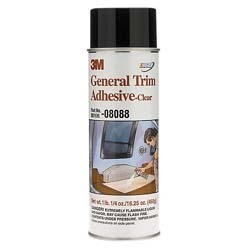 Clear, fast drying aerosol adhesive. Designed for bonding boat trim. A fast drying high strength 50% VOC clear adhesive in an aerosol container. Designed for bonding most types of trim used in boat trim except unsupported vinyl. Excellent for fabrics upholstery foam campers. Do not use on Styrofoam.