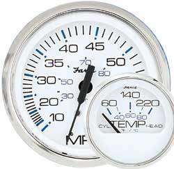 Faria Chesapeake White Stainless Steel gauges are perimeter lighted. White dial with stylish blue and black graphics, polished stainless steel bezel and domed glass lens.