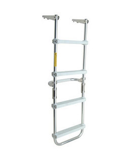Folds down to 4 steps for easy boarding. Folds and stows in locker underneath pontoon furniture. Cushioned standoff abuts pontoon “log". Durable 1" (3cm) diameter Anodized aluminum tube. Comfortable white traction molded poly steps. Includes securing strap. Stainless steel 6" (15cm) gudgeons attach to deck with included Shur-loc catches (76000).