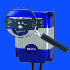 The brains of the new Intelligent Choice Charger are evidenced in thecontrol center which is located at the top of the charger. This membrane covered panel is positioned for easy view of all functions and easy access to the user selectable buttons. The control center features easy to read LED Indicators of charge status, user selectable