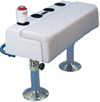With adjustable pedestals, can function as a leaning post or a seat. Adjustable pedestals allow quick, easy, secure changes in height. Storage compartment: 24-1/2" W x 5" H. Distance between pedestals: 32" on-center. 2201 Backrest fits any leaning post w/24" on-center rod holders. Adjusts from 16" to 32" High. Size: 15 3/4"D x 37 1/2"W x 11"H (leaning post only).