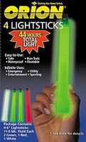 4 Pack of lightsticks: 2 Green (12 hour use) 1 Red (12 hour use) 1 White (8 hour use). Lightsticks are all 6" long. Non-flammable, non-toxic.