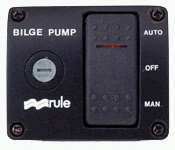 3-Way Lighted Rocker Panel Switch controls any pump equipped with an automatic float switch. This newly designed unit features a black plastic panel. It has a built-in fuse holder and an internally lighted rocker switch with 3 positions (automatic, off, or manual) with the Rule "fail-safe" spring return to "off" from the "manual" position. Specs: DC Volts - 12 Max Amps - 20 Width - 2-7/8" Height - 2-3/8"