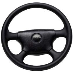 13 1/3" diameter, 4 Spoke. Plastic rim features rich leather grain pattern stitching and finger grips. Fits all standard 3/4" tapered shafts. Dish is 3 7/8".