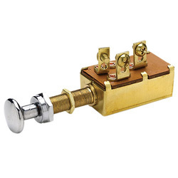 Heavy Duty Normally "Off". Single Pole Non-corrosive construction. Gasket sealed case protects against moisture and dust. Brass case, stem, terminals and mounting hardware. Screw-on type chrome plated brass knob and face nut. Mounting stem: 1-1/4"L (3.18cm) x 3/8" dia (.95cm). Position: Off - On #1 - On #2 Circuits: 2. Rated: 6V-36V DC. Fits panel thru: 1" (2.54cm)
