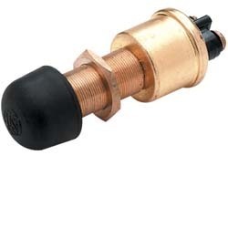 Heavy Duty 2 Position: Off - Momentary On Normally "Off" S.P.S.T. 6V-36V DC Non-corrosive construction Gasket sealed case protects against moisture and dust Molded plastic insulator with protective barrier between terminals Black moisture repellent rubber button cover Silver contacts Mounting stem: 1-3/8"L (3.49cm), 5/8" - 32 thread dia. Fits panel thru 1" (2.54cm)