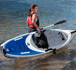 QUIKPAKTM KAYAKS The Grab And Go Kayak with integrated storage carry system. Easily folds into itself! Portable and lightweight only 16 lbs DIN safety chamber and tracking fins for easier steering Double LockTM/ Mini Double LockTM valves 900D polyester (top), 1000D x 1000D polyester laminated with 24 gauge PVC (bottom) Handles for easy boarding Stretch cargo net for storage Foot rests Carry handles Includes paddle and pump