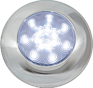 14 high-output Great White diodes for bright illumination for interior applications.. Operating range is 9-16 volts. Mounts on 2-3/16" centers with two hardwired leads. 3" diameter, .7" deep.