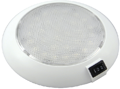 12 Volt low profile surface mount dome light with a diameter of 5-1/2". 3 position rocker switch for "White/Off/Red". The dome light has 21 warm white and 9 red LEDs. The warm white light provides a natural color setting for living spaces while the red light provides night vision and is used for spaces such as cockpits and steering stations. Available with white plastic or stainless steel housing.