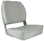 Folding boat seat with plush padding and durable upholstery. Rigid plastic injection molded frame with standard hinges, threaded T-nuts and stainless steel screws. Includes retention strap with snap.