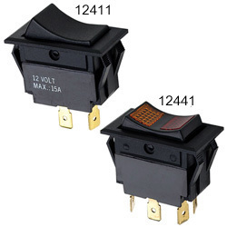 Available illuminated or non-lighted. Economical, durable rocker switches. Snap mount thermo plastic housing. 12V - 15 Amps. Fits panels up to 1/4'' thick. Overall size: 1'' x 1-11/16''. Cut-out size: 1-3/8'' x 7/8''. With plug-in type terminals.