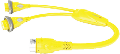 Y-adapters are used to connect one dockside outlet into two weatherproof connectors. All plugs and connectors have side grips; are made to NEMA standards; and offer a universal fit with all other brands. 30 Amp connections also come with Powersmart LED power indicators. All cables are rated up to 600V; 105C. Configuration is 30A female (2) to 30A male.
