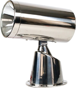 Cast 316 stainless steel base and stamped 304 stainless steel body and reflector for a classic, traditional look with a contemporary flair. Halogen bulb produces 165,000 candlepower. Waterproof, with an IP rating of 67. Two speed motor. Digital phone cable connection, 15' cable included. Joystick control panel included. Wireless second station sold separately. Five year warranty. 4 1/2" diameter, 9 7/8" high, 8 1/4" long. 12 volt.