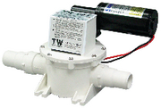 T-series. Runs dry without harm. 6 amp power draw on 12V DC system. Self-priming up to 10' of water. Flow rate of 300 GPH.