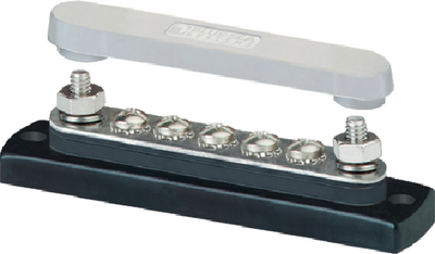 Small 100A tin plated copper bus for consolidating wires in tight places. Includes insulating cover. 5 8-32 screw terminals.