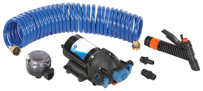 Compact,efficient,corrosion resistant 3 chamber diaphragm pump can run dry without damage. Includes Pumpgard strainer,nozzle and 3/4" hose barb fittings. Sealed pump head and motor,self-priming up to 6'. ISO 8846 Marine ignition protection. Available in 2 models. With hose included or without hose. 4.0 GPM, 60 PSI, 9 amp @10 psi.